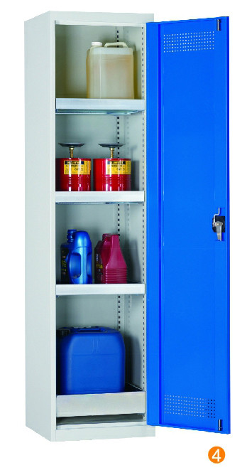 用于污染液體的存儲(chǔ),可調(diào)式隔板,上下25mm可調(diào) 可移動(dòng)式底部貯存盤(pán)高100mm,無(wú)縫焊接,更好防泄漏 門(mén)板的頂部及底部帶通風(fēng)孔,自然通風(fēng),門(mén)開(kāi)啟角度12。 隔板/貯存盤(pán)式層板每層最大承重60KG (可抽出式除外) 柜體最大承重承重:300KG